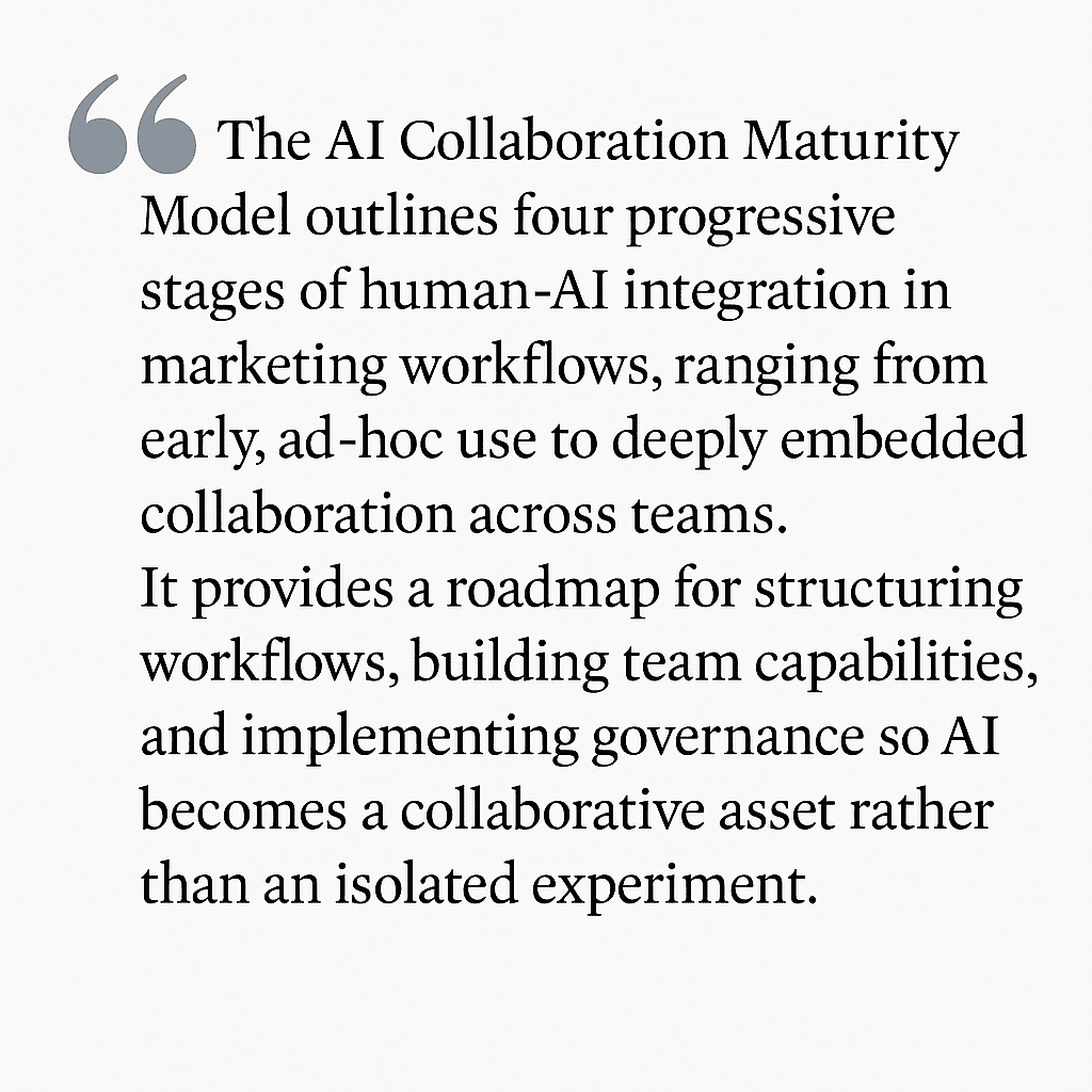 Scale in phases: Don’t try to do it all at once. Research around the AI Collaboration Maturity Model shows that teams typically move from scattered, one-off AI use to fully integrated workflows over time. Here’s what this model entails: