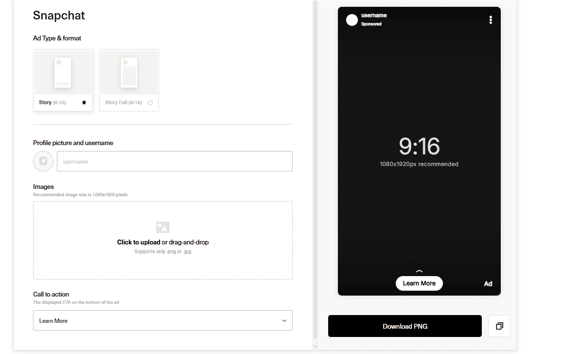 Side note: If you’re interested in creating and testing ad creatives fast, use our free ad mockup generators. All you need to do is pick the ad type and format, and add some details, like your CTA and visual before you download the results. Here’s what the Snapchat mockup generator looks like: