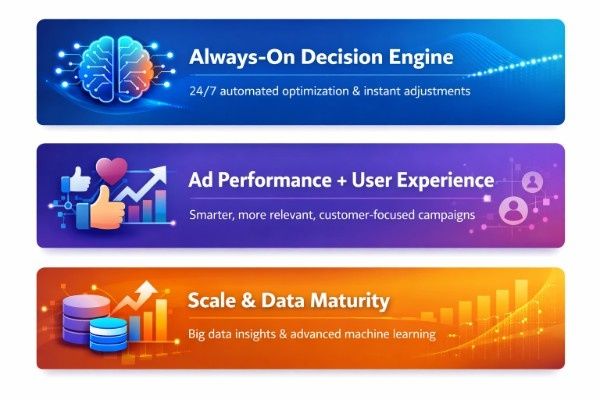 For example, Google Ads Smart Bidding makes these decisions in milliseconds during each auction, operating at a speed and scale no human team could realistically match.