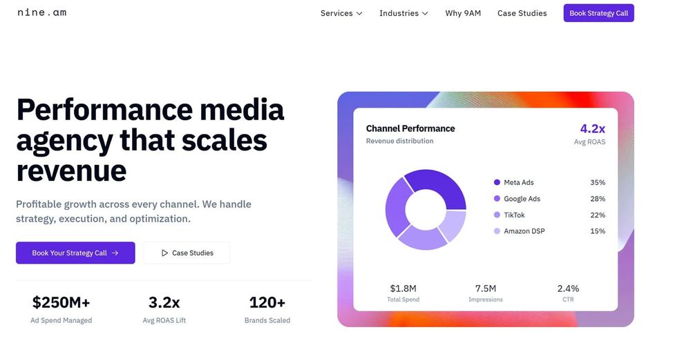 1. 9AM: 9AM is a performance powerhouse in NYC, managing $250M+ in spend and delivering benchmark-crushing results like 7X ROAS and 70% lower CPAs. Their strength comes from combining media buying, creative, influencers, and analytics into one scalable system.