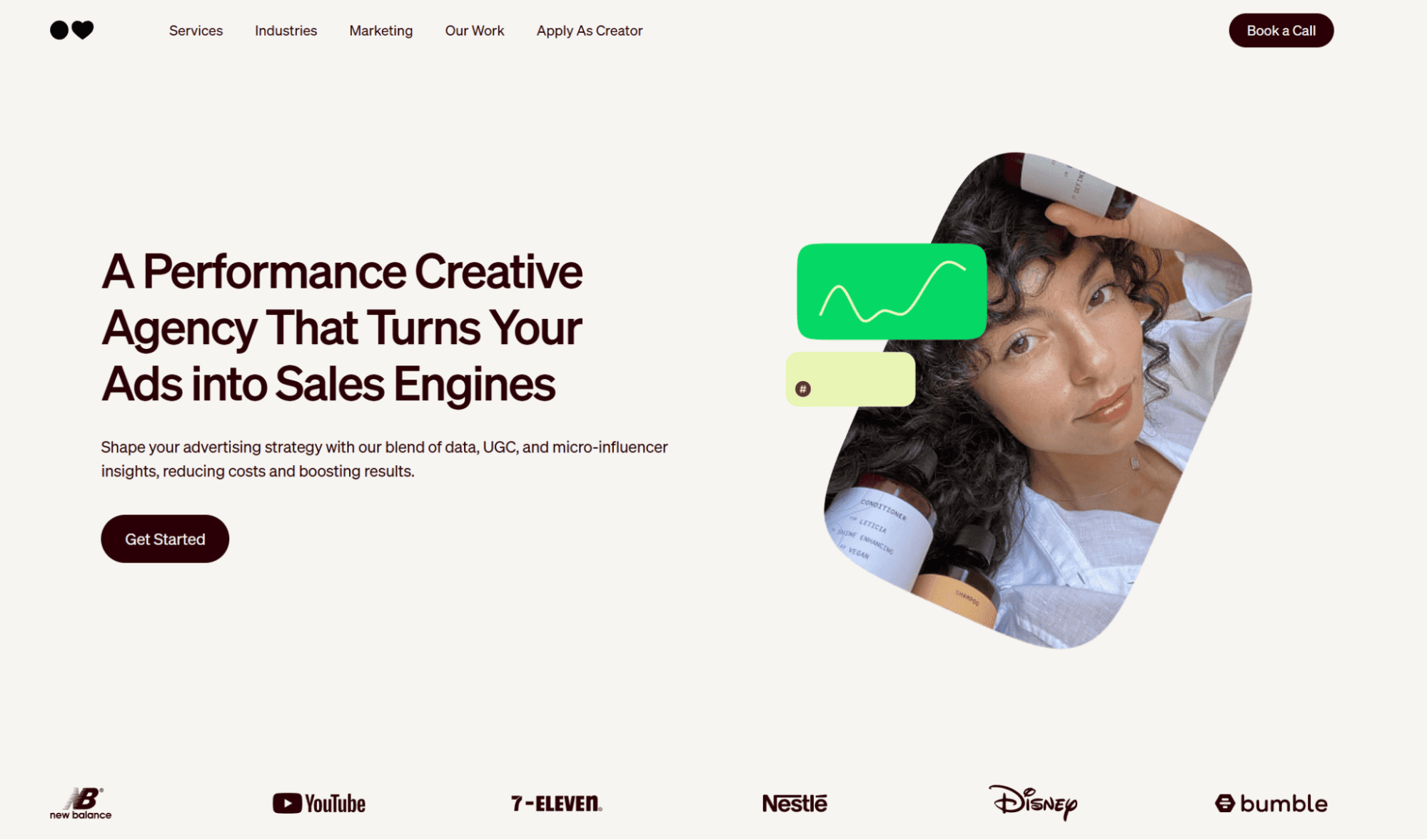 The agency works directly with the top 2% of creators, giving you authentic, high-performing influencer & UGC that fuels paid channels.