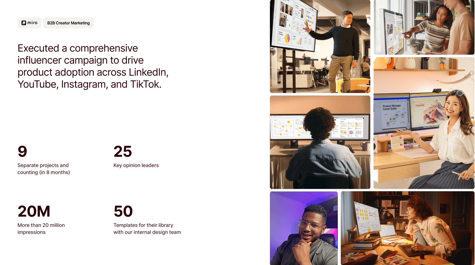A standout example of their work is the influencer-driven performance program they ran for Miro.