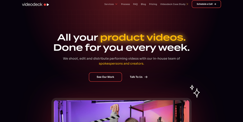 Videodeck is a modern video production agency built specifically for SaaS and tech companies, offering a streamlined, productized approach that makes high-quality video creation fast, predictable, and scalable.