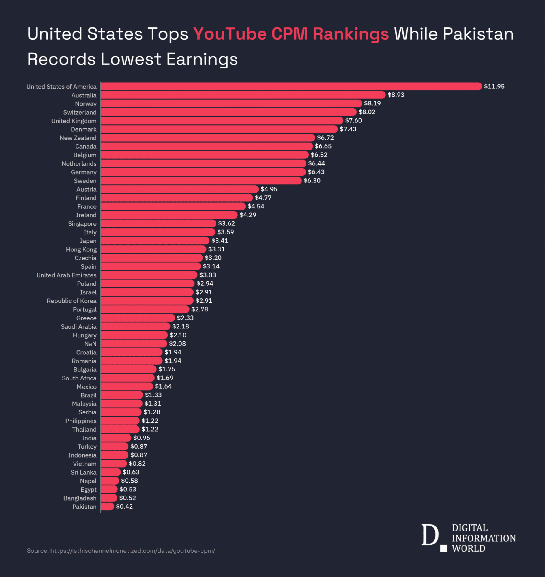 For instance, the U.S. is highly competitive, pushing costs up; the U.S. median CPM is about $11.95 in one data set, versus India being under $1.00 in another. Here’s the complete breakdown according to Digital Information World: